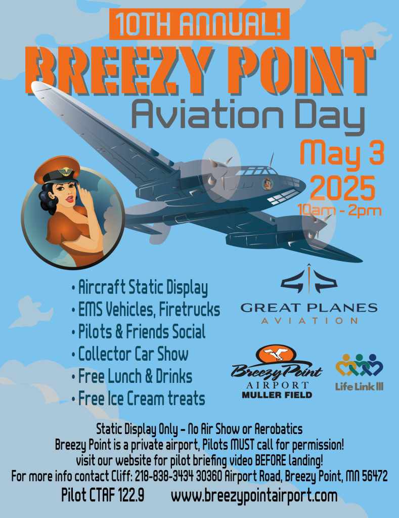 Lindsay Balmer and Cliff Muller invite everyone to their 10th Annual Breezy Point Aviation Day, May 3rd, 2025 from 10am to 2pm at Breezy Point Airport Muller Field.