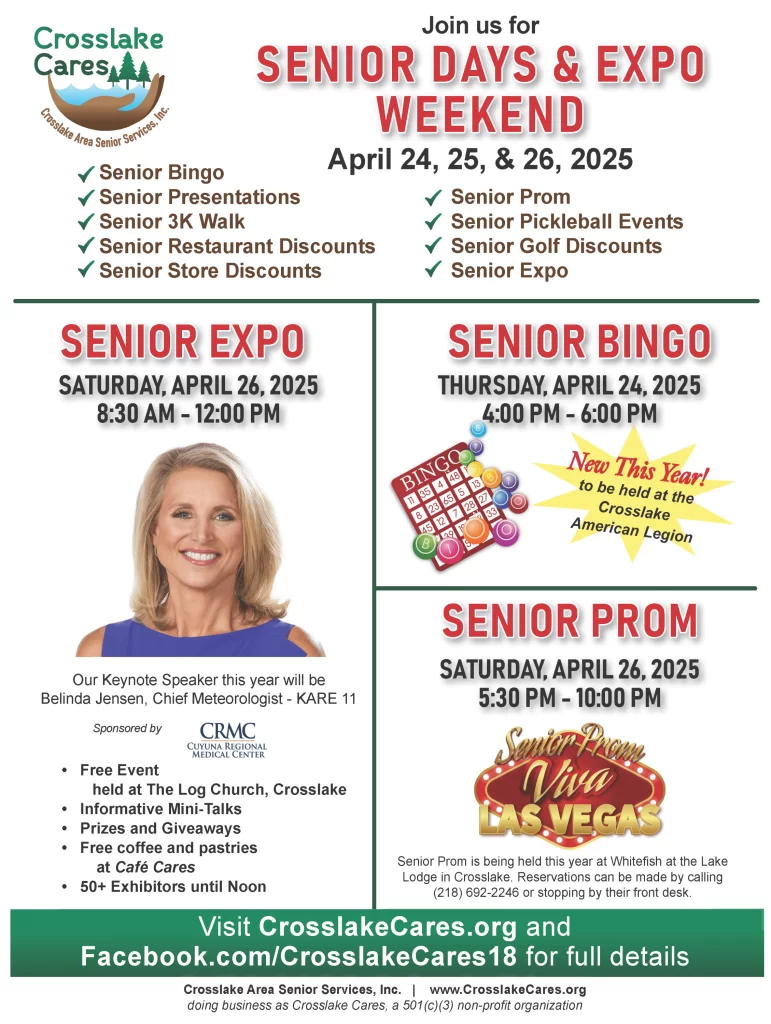Jennifer Lowe, Director of Community Relations and Vanessa Ruedisili of the Marketing Team and Advisory Committee, invite everyone to enjoy the Crosslake Cares “Senior Days & Expo Weekend” April 24th, 25th, and 26th, 2025 in Crosslake, MN.