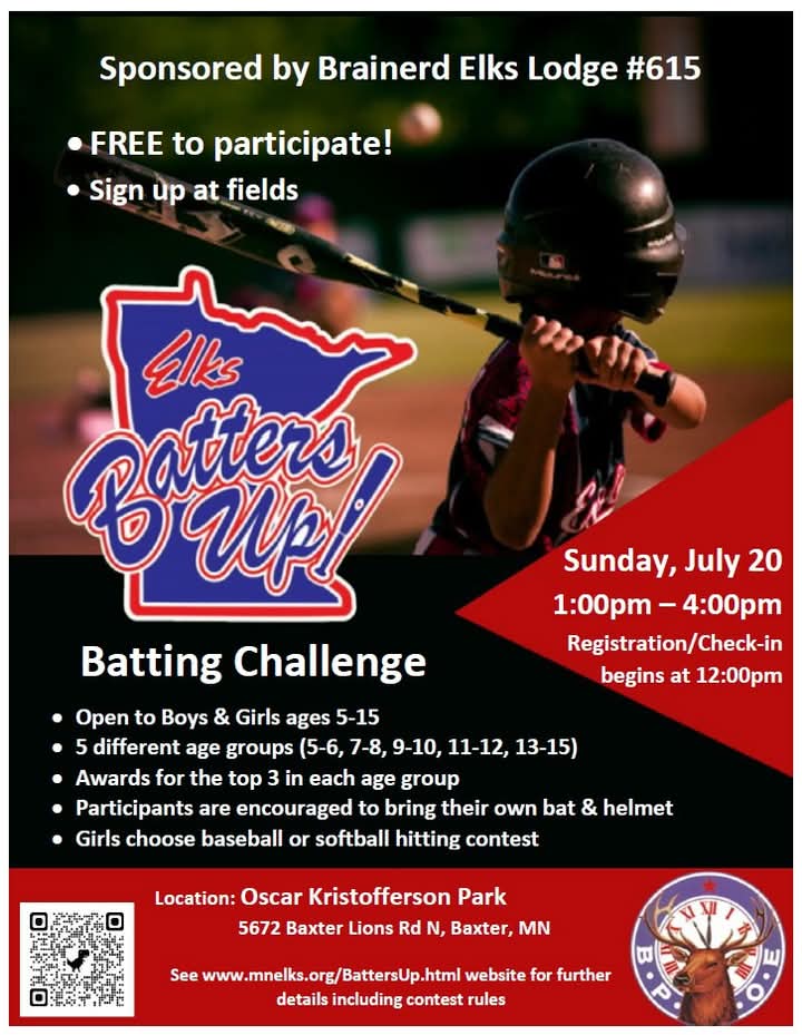Jeremy Allord from the Brainerd Elks Lodge #615 invites youth ages 5-15 to participate in this FREE Batting Challenge event on Sunday, July 20th, 2025.