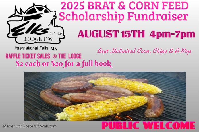 The International Falls Elks Lodge 1599 is firing up the grill for a great cause! Mark your calendars for Friday, August 15th, from 4-7pm, as the Elks host their 2025 Brat and Corn Feed Scholarship Fundraiser.