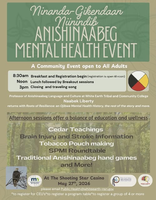 Home Events KRJB-KRJM-KKCQ Community Events Anishinaabeg Mental Health Event Anishinaabeg Mental Health Event + Add to Google Calendar + iCal / Outlook export 00 days 00 hours 00 minutes 00 seconds Tags: Anishinaabeg, Mental Health Event