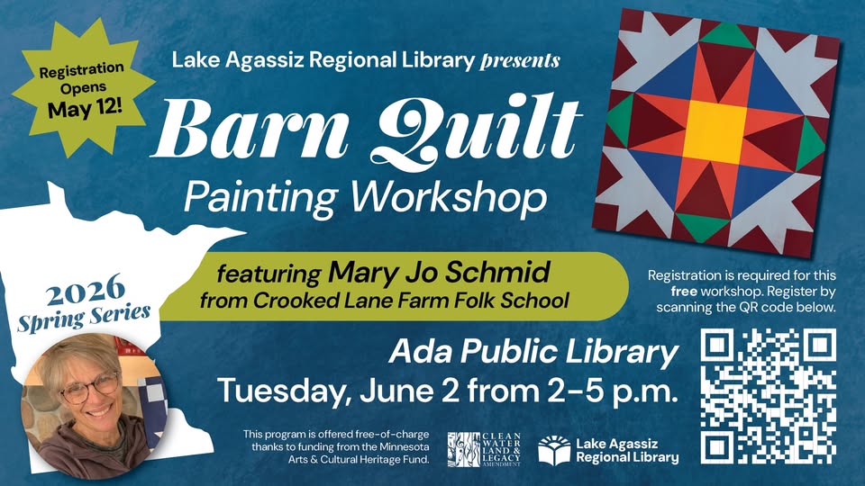 Join the Ada Public Library for a free workshop to create your very own 1’x1′ Barn Quilt with Mary Jo Schmid on Tuesday, June 2, 2026 from 2-5pm. Join the hands-on workshop and paint your very own Barn Quilt under the expert guidance of Mary Jo Schmid from Crooked Lane Farm Folk School.