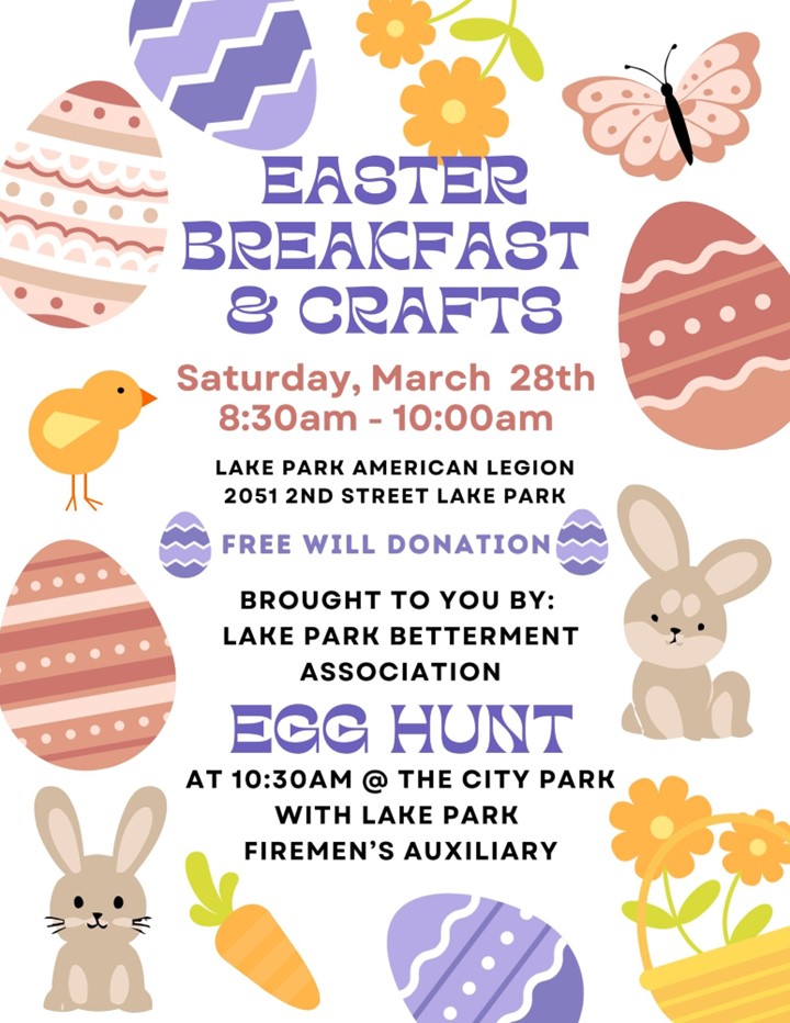 Home Events KRJB-KRJM-KKCQ Community Events Easter Breakfast and Crafts in Lake Park Easter Breakfast and Crafts in Lake Park + Add to Google Calendar + iCal / Outlook export 00 days 00 hours 00 minutes 00 seconds Tags: crafts, Easter Breakfast, egg hunt, Lake Park American Legion, Lake Park Betterment Assn