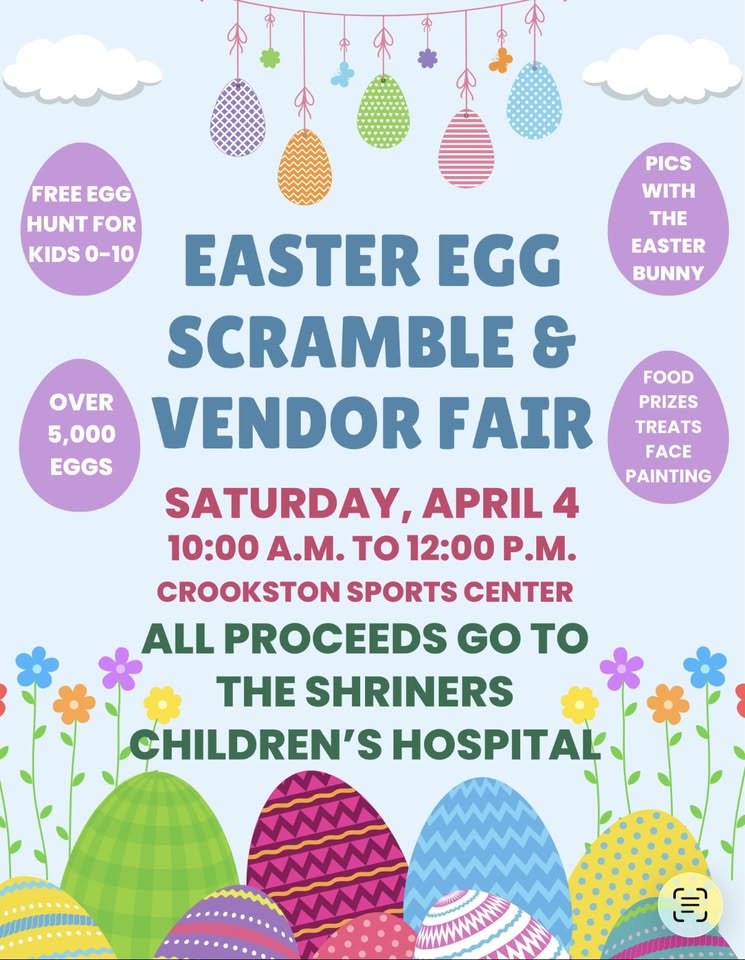 Home Events KRJB-KRJM-KKCQ Community Events Easter Egg Scramble and Vendor Fair in Crookston Easter Egg Scramble and Vendor Fair in Crookston + Add to Google Calendar + iCal / Outlook export 00 days 00 hours 00 minutes 00 seconds Tags: Crookston, Crookston Sports Center, Easter Egg Scramble, vendor fair