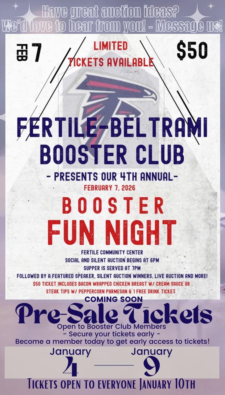 Home Events KRJB-KRJM-KKCQ Community Events FB Booster Club Fun Night FB Booster Club Fun Night + Add to Google Calendar + iCal / Outlook export 00 days 00 hours 00 minutes 00 seconds Tags: Fertile Beltrami Booster Club, Fun Night, silent auction, social, speaker, supper
