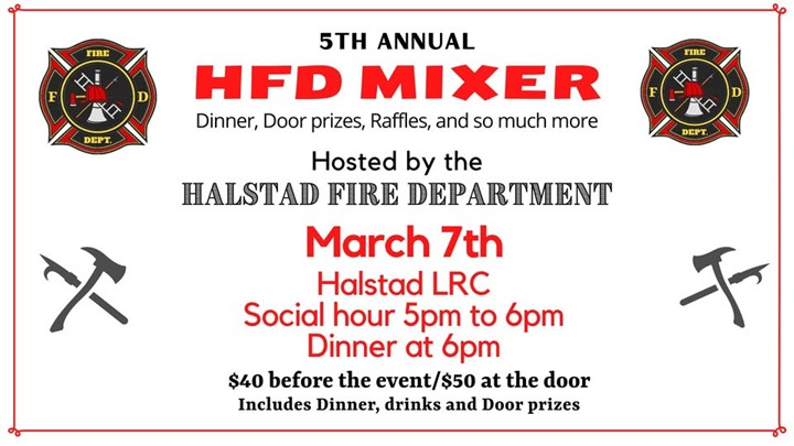 Home Events KRJB-KRJM-KKCQ Community Events Halstad Fire Department annual Mixer Halstad Fire Department annual Mixer + Add to Google Calendar + iCal / Outlook export 00 days 00 hours 00 minutes 00 seconds Tags: Halstad Fire Department, Halstad LRC, Mixer
