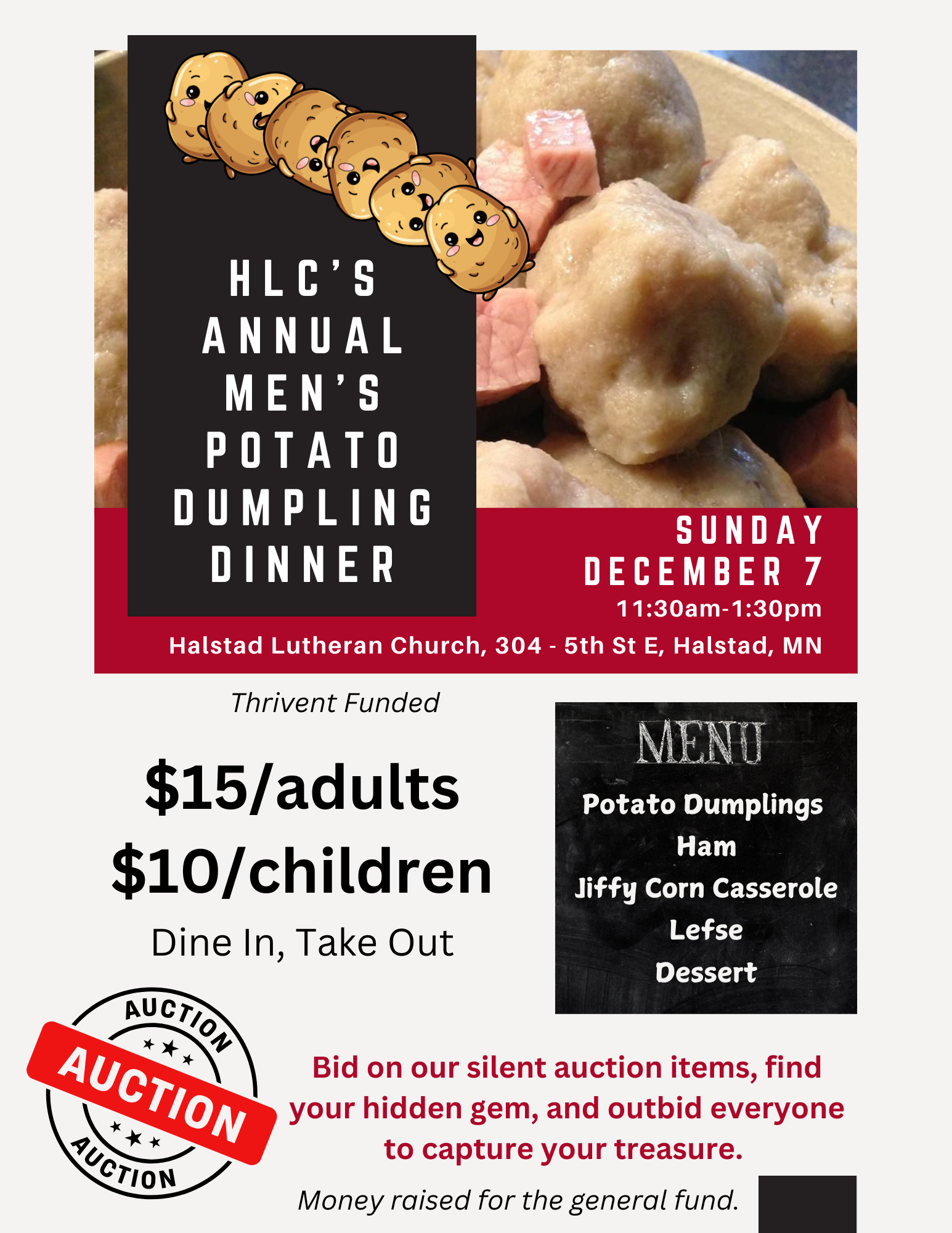 Home Events KRJB-KRJM-KKCQ Community Events Halstad Lutheran Church Potato Dumpling Dinner Halstad Lutheran Church Potato Dumpling Dinner + Add to Google Calendar + iCal / Outlook export 00 days 00 hours 00 minutes 00 seconds Tags: Halstad Lutheran Church, potato dumplings, silent auction