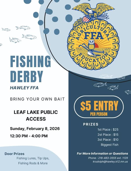 Home Events KRJB-KRJM-KKCQ Community Events Hawley FFA Fishing Derby Hawley FFA Fishing Derby + Add to Google Calendar + iCal / Outlook export 00 days 00 hours 00 minutes 00 seconds Tags: Fishing Derby, Hawley FFA, Hawley School, Ice Fishing Derby