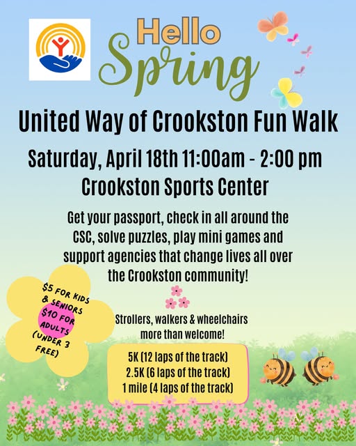 The United Way of Crookston is having a Fun Walk on Saturday, April 18, 2026 from 11AM to 2PM at the Crookston Sports Center. Cost is $5 for kids and senior citizens, $10 for adults, and free for ages under 3.