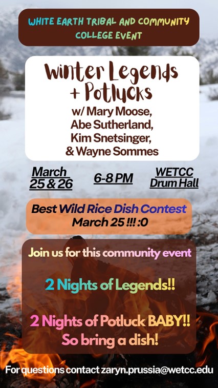 Join the White Earth Tribal and Community College for “Winter Legends + Potlucks” at White Earth Tribal and Community College Drum Hall on Wednesday, March 25th and Thursday, March 26th from 6-8pm.