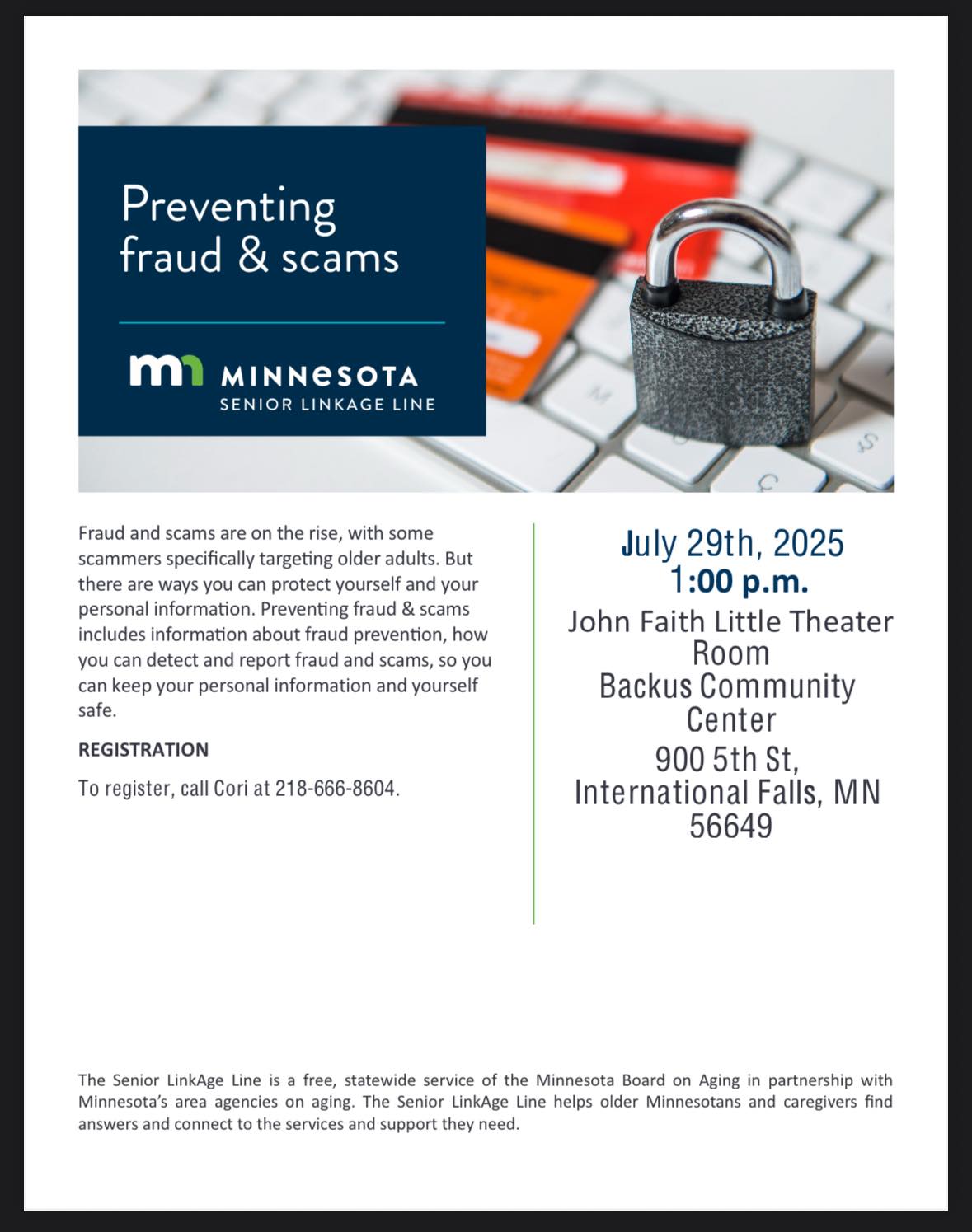 Cori Horton, alongside Senior LinkAge Line will have a presentation at Backus discussing fraud and scams and how to avoid them.