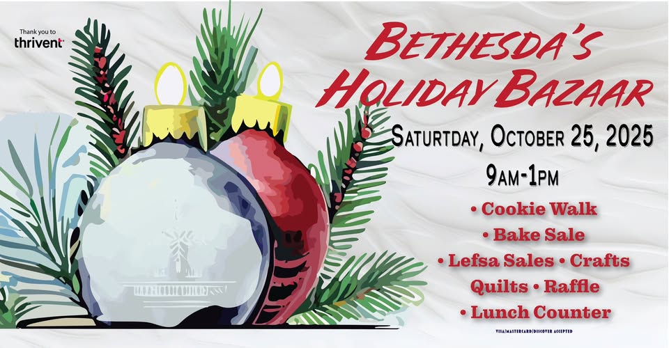 Judie Birk, Co-chair of the Bethesda Lutheran Church Holiday Bazaar in Malmo, MN, invites everyone to this event on Saturday, October 25, 2025 from 9am to 1pm.