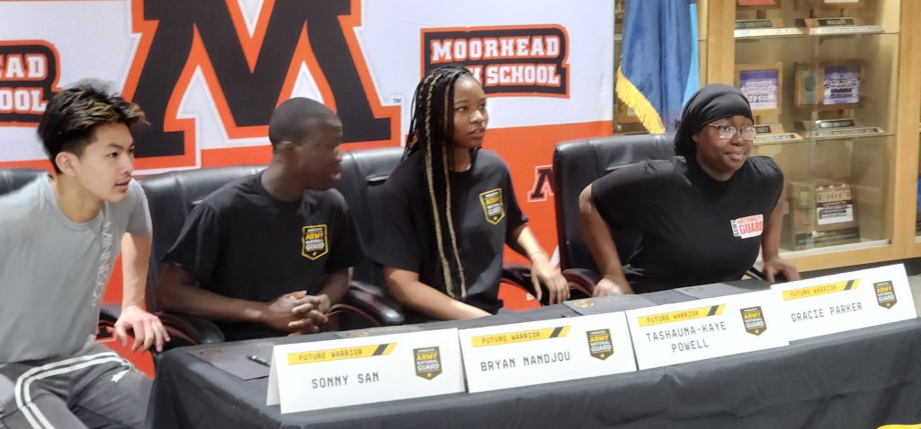 Joining Tashauna-Kaye Powell and Gracie Parker in their enlistment on Wednesday included fellow Moorhead students Sonny San and Bryan Nandjou.