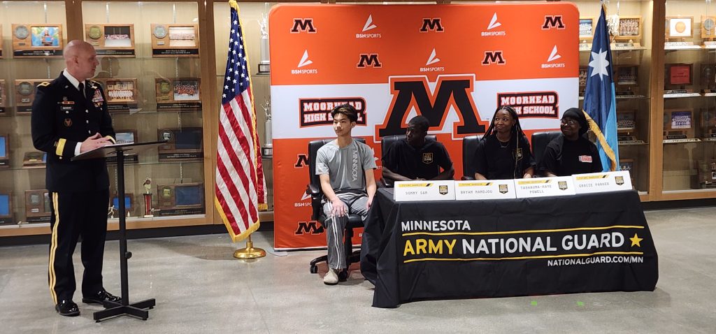 The Minnesota National Guard held a Signing Day Ceremony at the Moorhead High School on Wednesday morning, and officially welcomed four students into their ranks. National Guard Recruiter Staff Sergeant Kaden Murphy says it was great to welcome four new enlistees to their ranks, while also putting the spotlight on them.